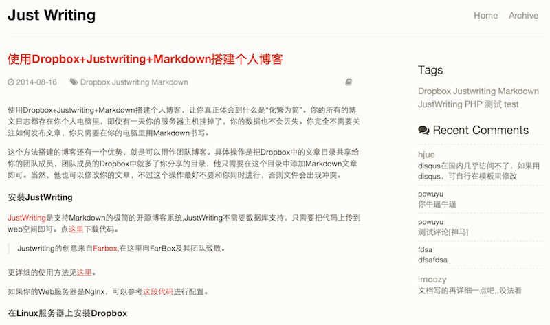 如果是在自己的VPS上搭建Justwriting,建议使用Dropbox来同步文章